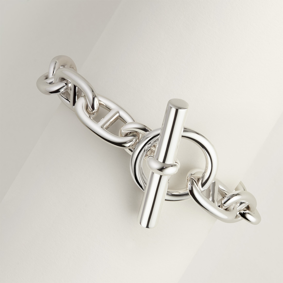 シンプルで存在感のあるチェーンネックレス「シェーヌダンクル」。 コマを繋げたチェーン本体とT型の留め具で固定するエルメス定番人気のネックレスです。